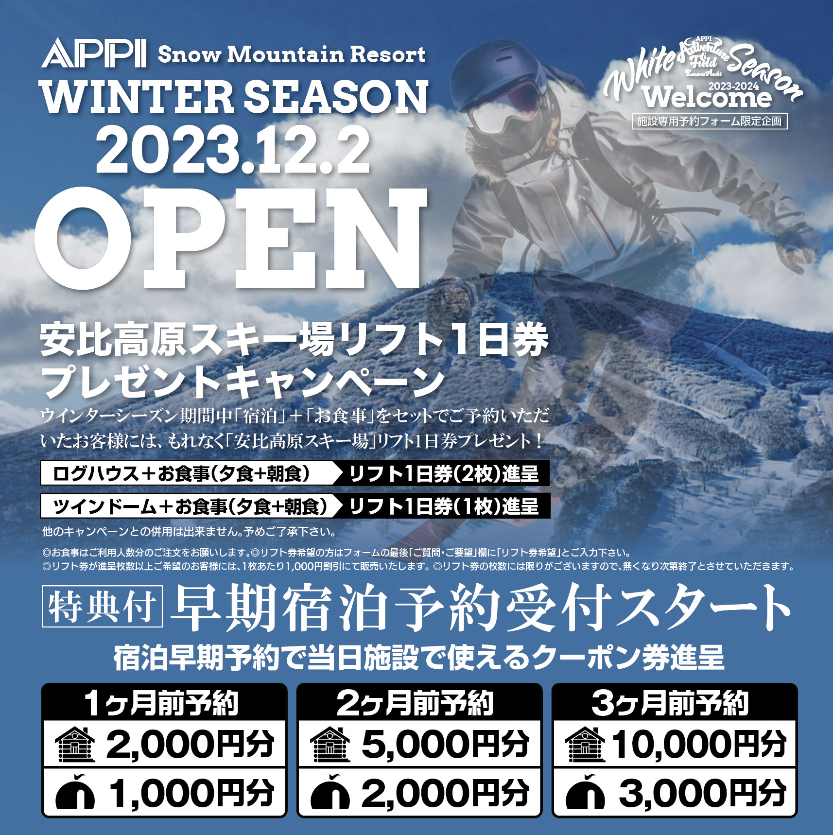 さらに毎年スキーヤー&ボーダーに人気の安比高原スキー場リフト1日券が付いた宿泊プランに、早期宿泊予約のお客様には施設で使えるクーポンも進呈!