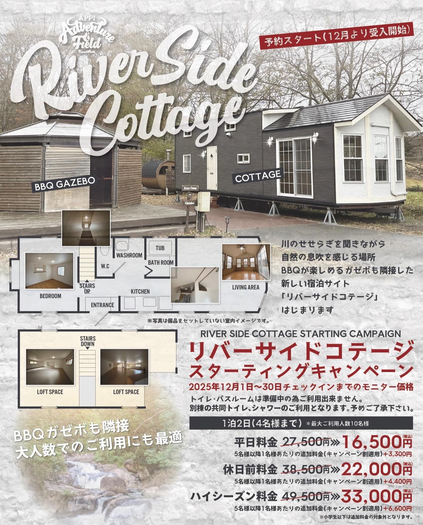 さらに、今月は新しくスタートしたリバーサイドコテージがお得にご宿泊出来るスターティングキャンペーンも実施しております。