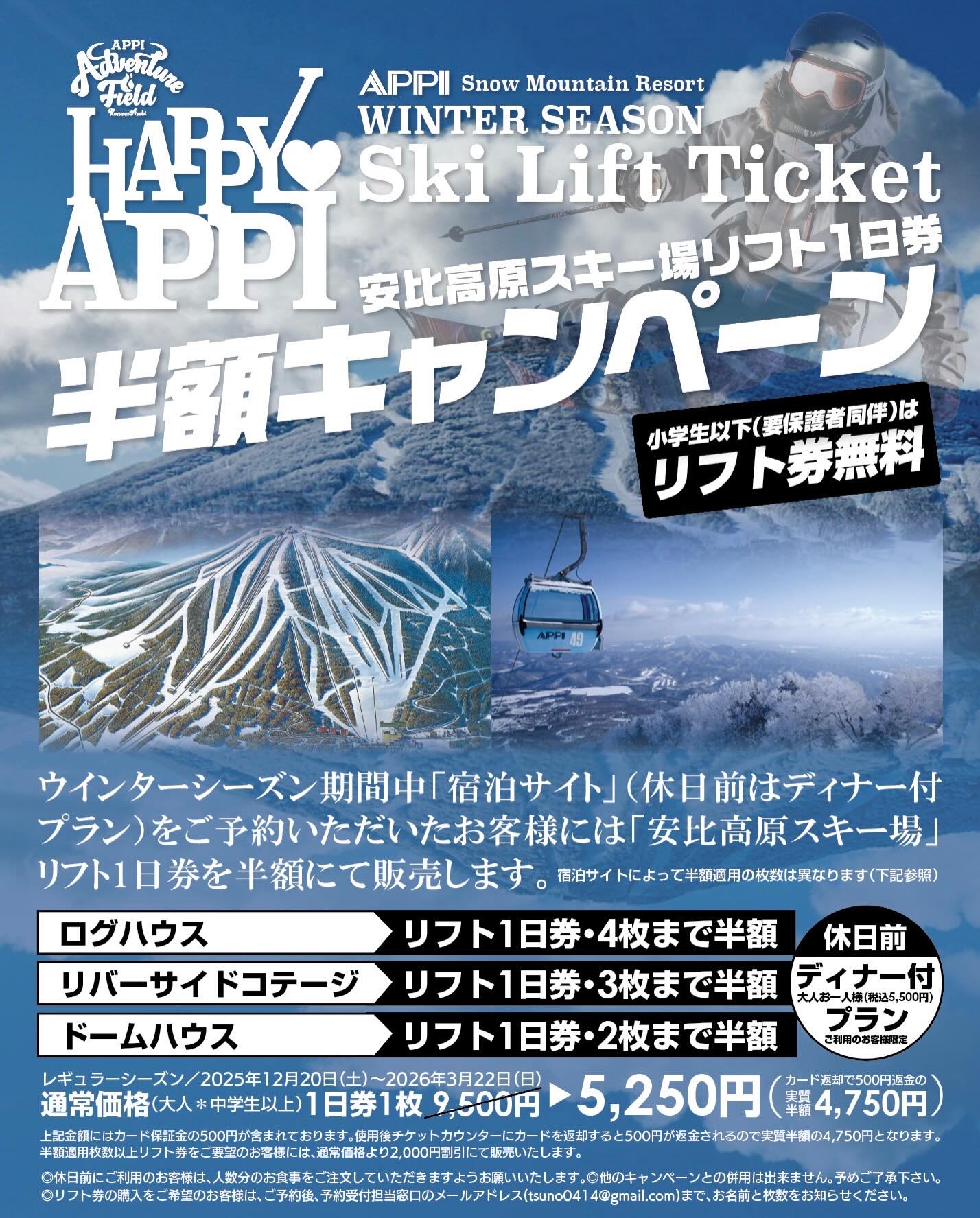 今シーズンもクルマアソビアドベンチャーフィールド安比では、ご宿泊いただいたお客様にリフト券が半額でお求めいただけけるキャンペーンを実施いたします。