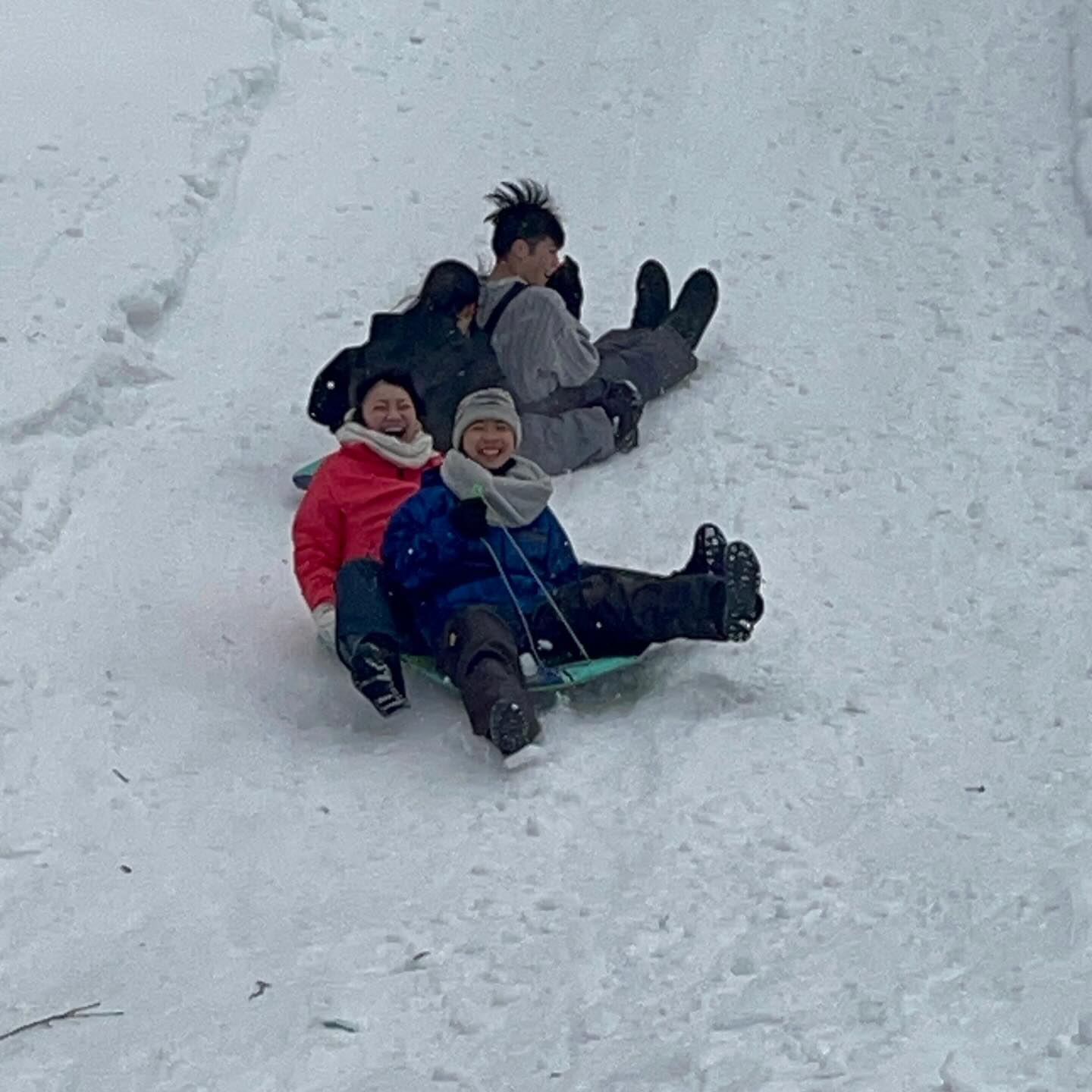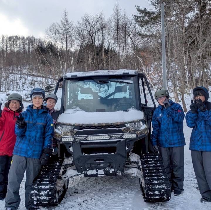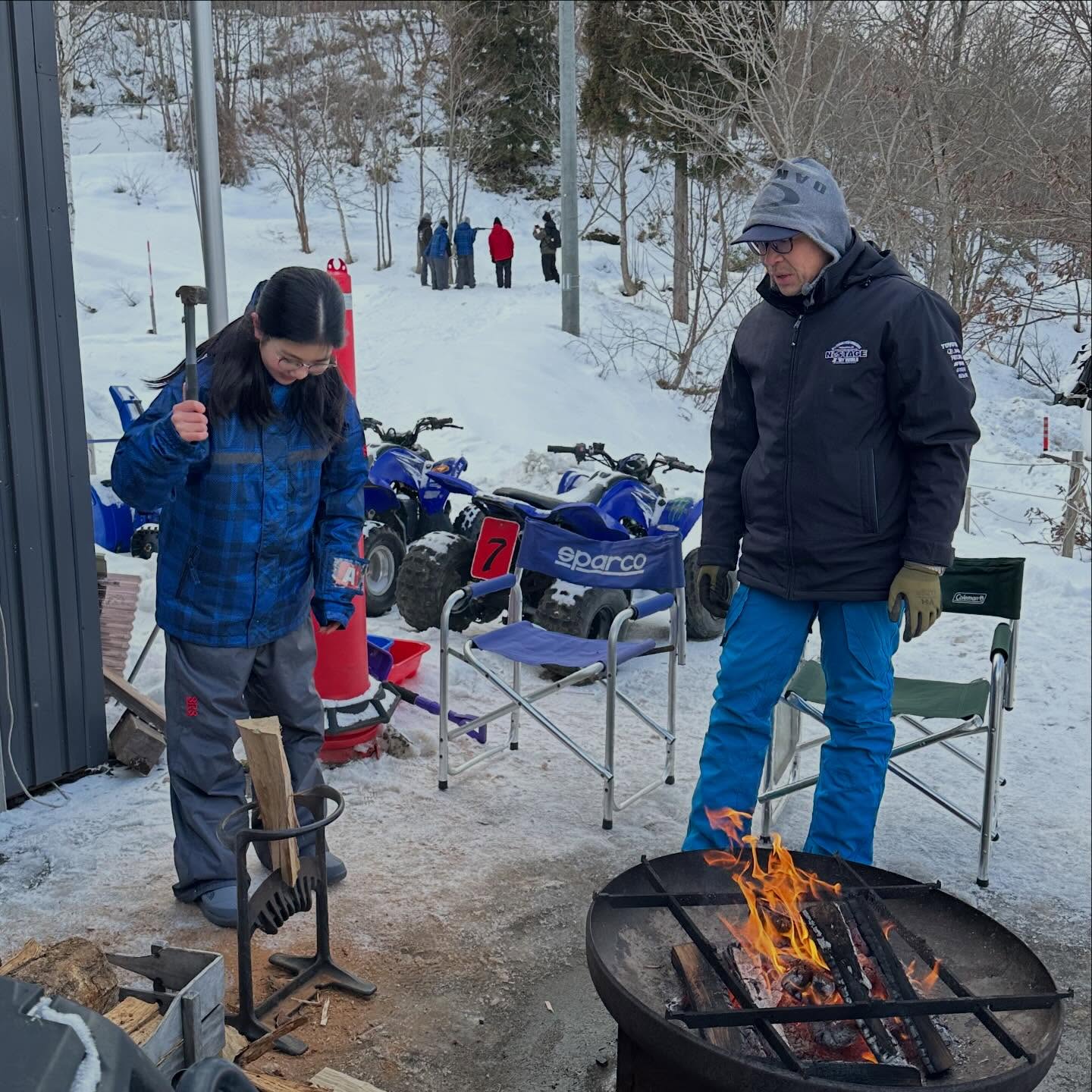 四輪バギーに乗って雪原の走行体験やソリあそびを楽しんだり、自然体験教室として、薪割りや火起こし体験、
