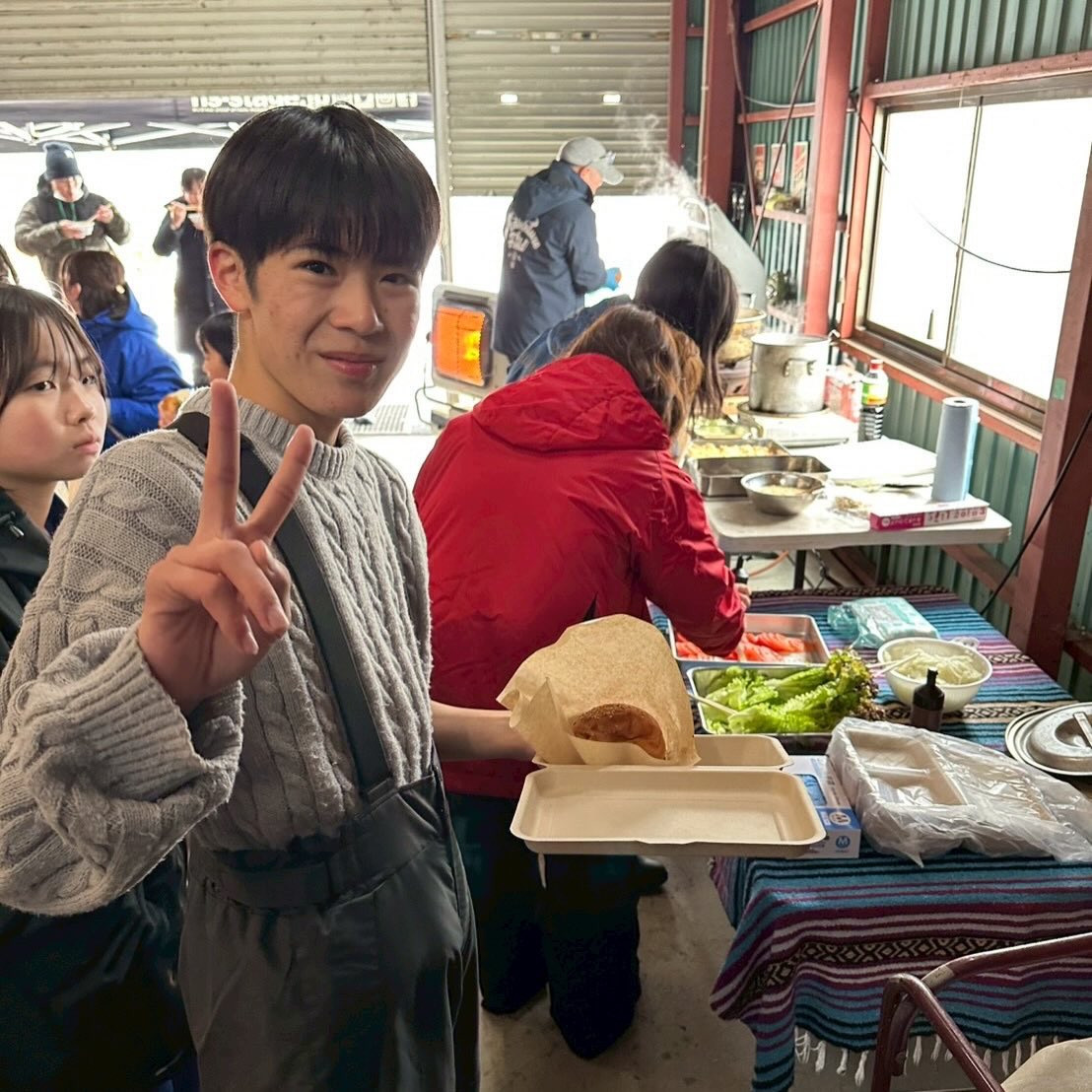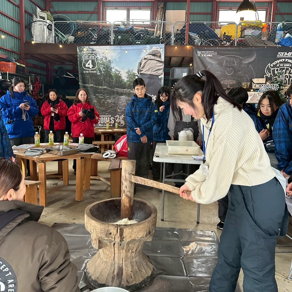 お昼はみんなで「杵」と「臼」を使ってついた餅つき大会、最後は施設で人気のファットキングバーガーを自分たちで盛り付けて召し上がっていただくプログラムで体験学習を締めくくりました。