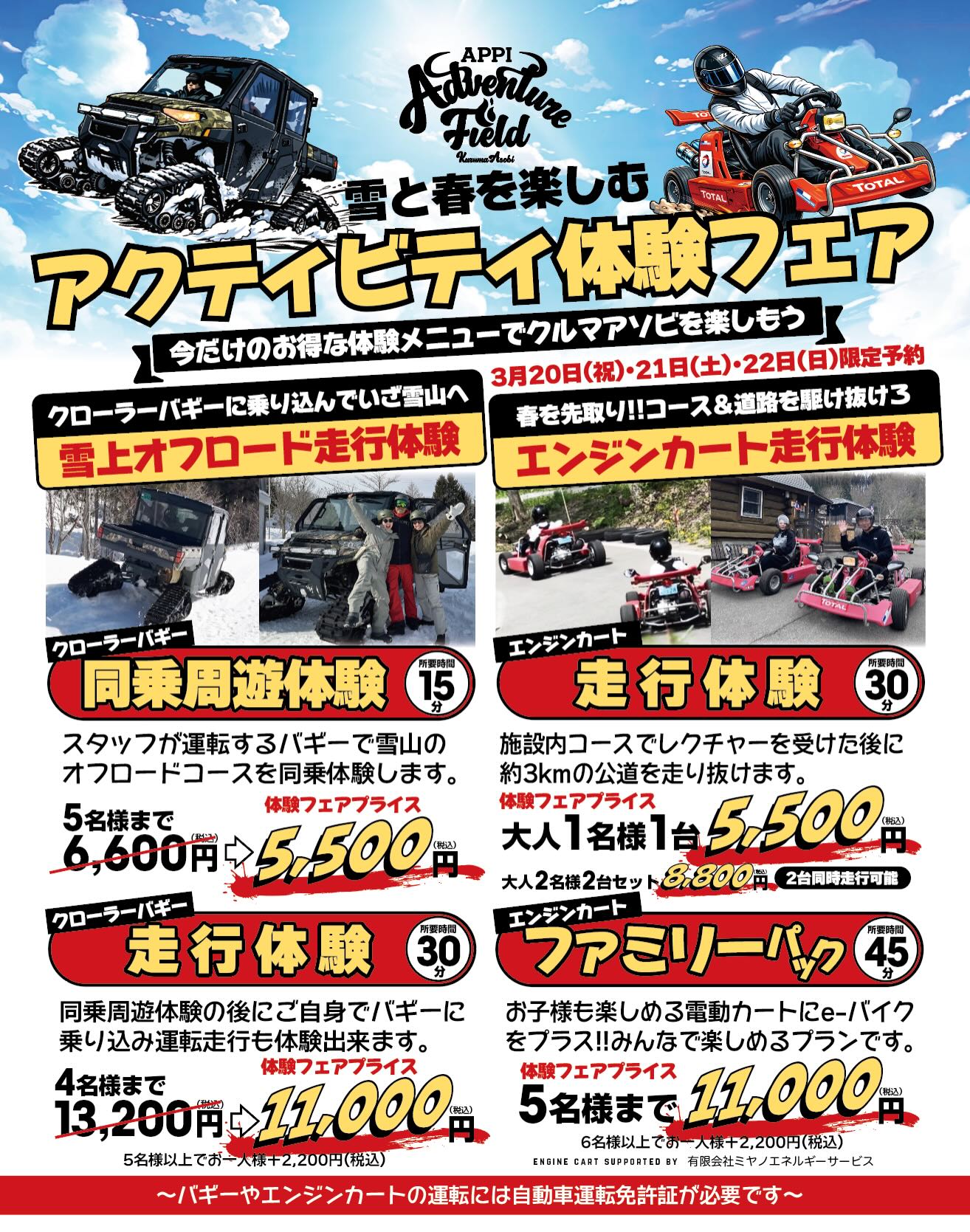 まだ雪景色が見られるこの時期に、エンジンカートで爽快に駆け抜けましょーーー